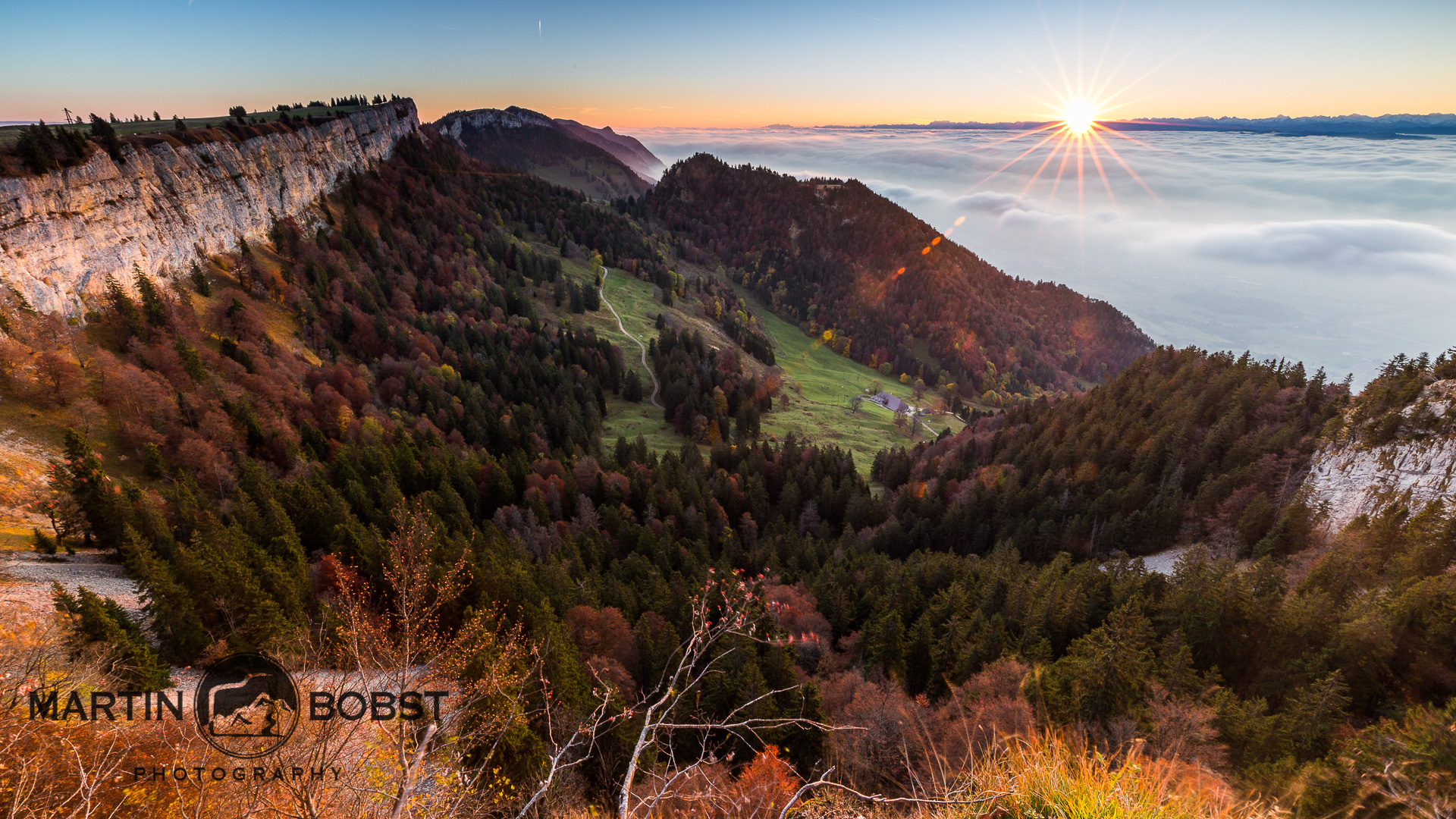 Kurzentschlossen fuhr ich heute Morgen zu den nahe gelegenen Grenchenberge. Ich hoffte auf ein schönes Nebelmeerfoto. Als ich losfuhr konnte man die Sterne wunderbar sehen, so befürchtete ich, keinen Nebel anzutreffen und dass das frühe Aufstehen vergebens war. Je mehr ich mich Grenchen näherte, um so dichter wurde der Nebel, was mich sehr erfereute.